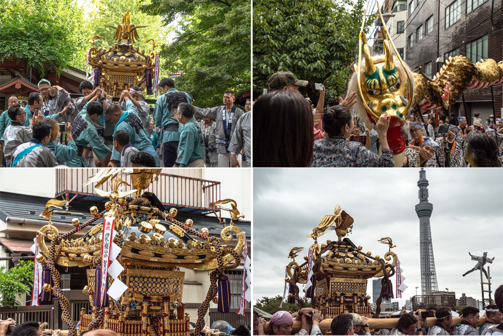 木遣りを先頭に御神輿と金龍の舞が旧聖天町、聖天横町を練り歩きます。
