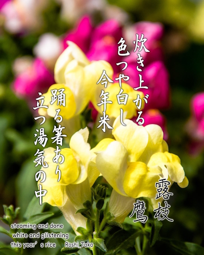 炊き上がる 色つや白し 今年米