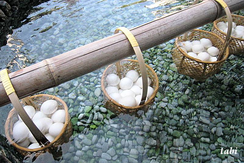 店先に源泉を引き込んだ温泉卵専用池で出来立てを販売しています。