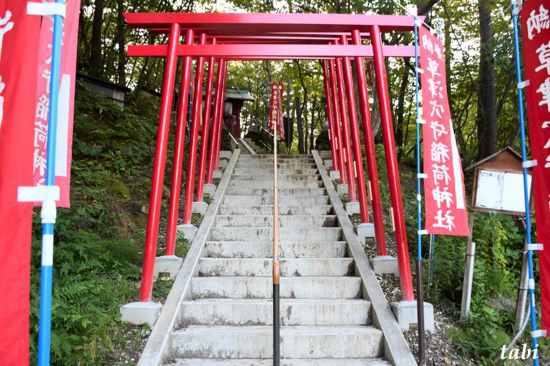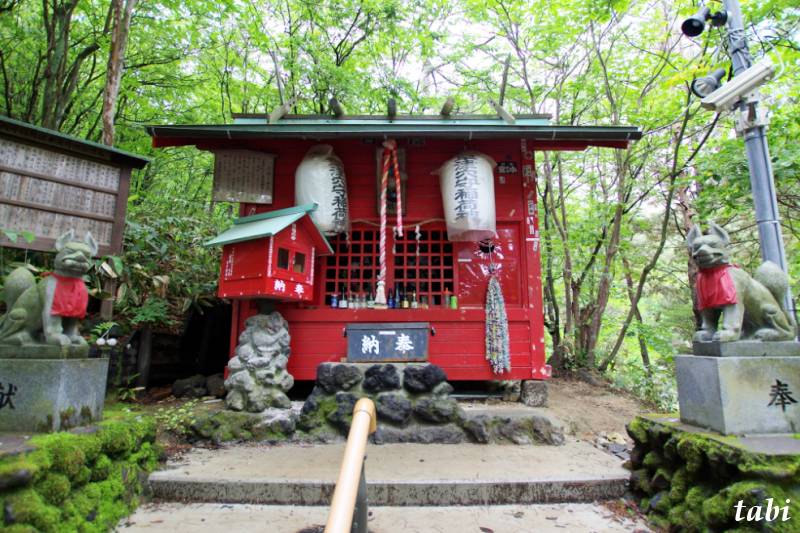 明治四十年ごろ、東京の山崎染物店の主人が草津へ湯治に通い、病気平癒の記念に、常々信仰していた、穴守稲荷をこの場所に分霊し勧請した。