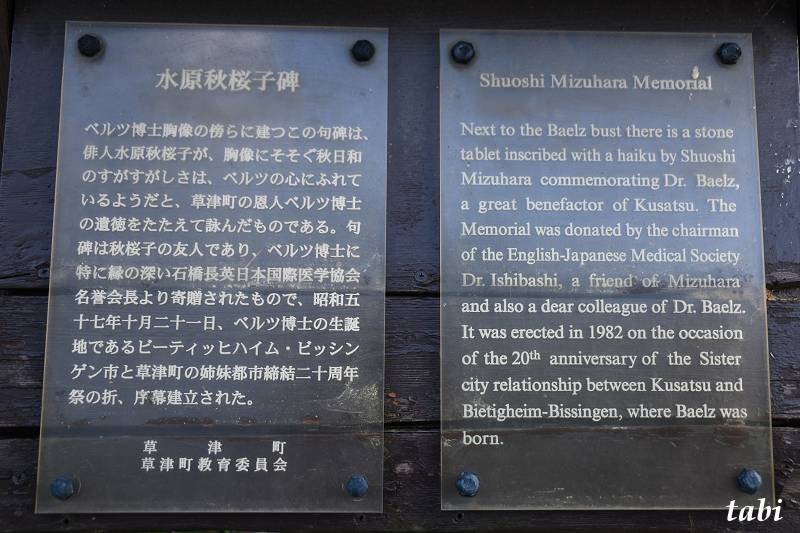 俳人・水原秋桜子が草津町の恩人であるベルツ博士の功績をたたえて詠んだ句が刻まれた石碑です。