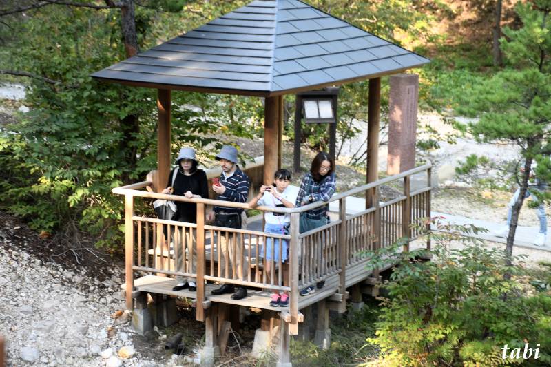 西の河原露天風呂の上流から流れ落ちる源泉の滝の下に作られた屋根の有る見晴小屋です。東屋(あずまや)とは、庭園や公園に設置される、柱と屋根のみで構成された簡素な建物を指します。