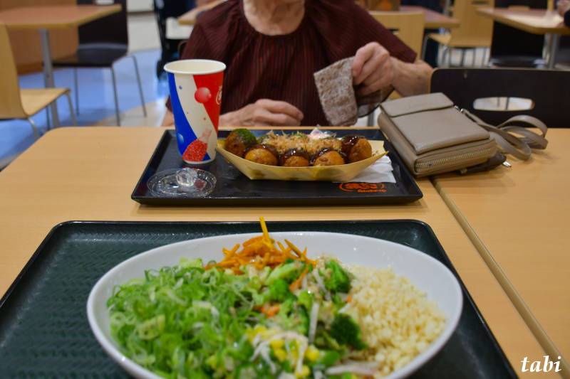 ショッピングモールなどの大規模商業施設内にあり、複数の飲食店が共同の座席スペースを囲むように配置された飲食エリアです。