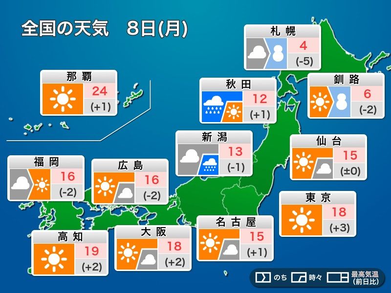 今日8日(月)は関東や近畿では、朝晩と昼の気温差が大きくなる予想です。