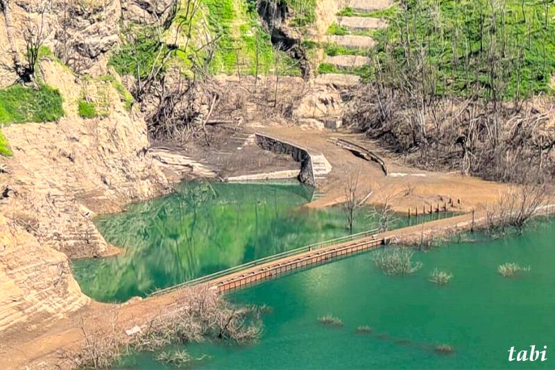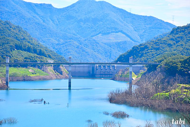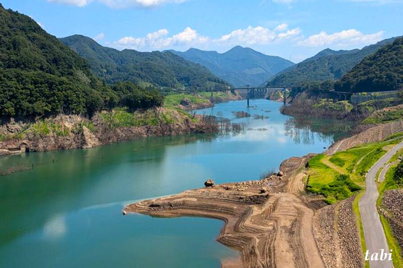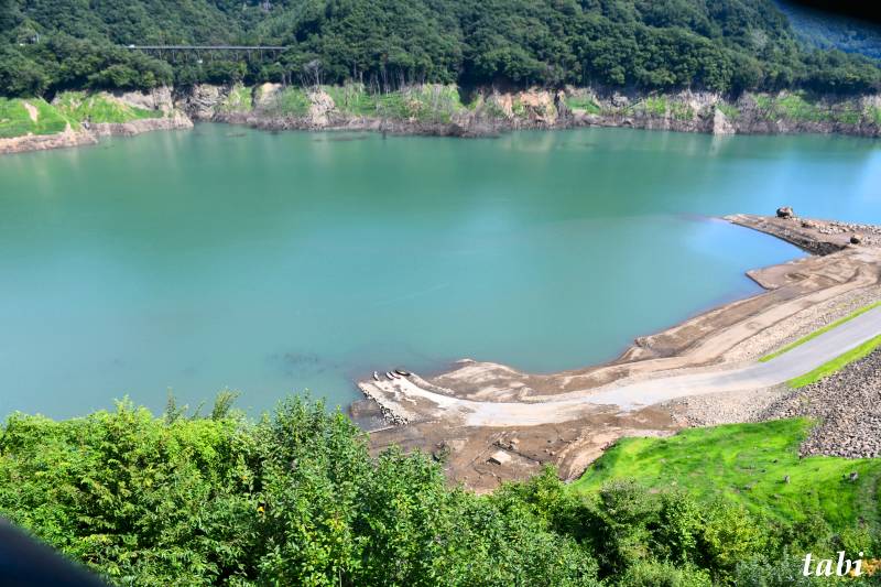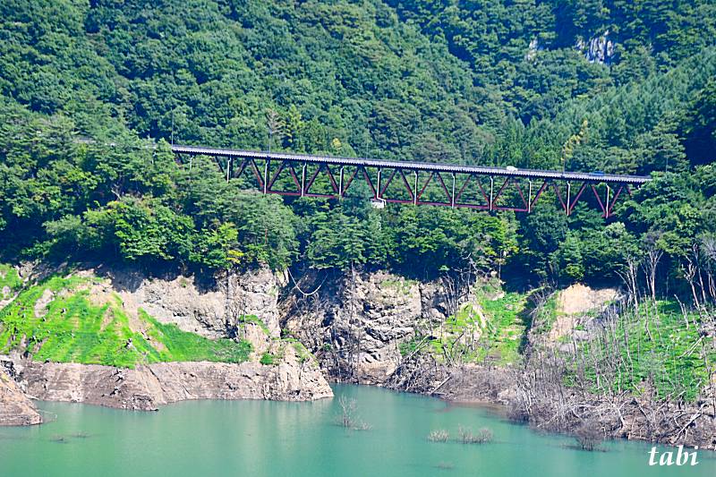 貯水率の低下により、ダム湖に水没した旧JR吾妻線の鉄橋やトンネルなどの遺構が現れる状況となっています。