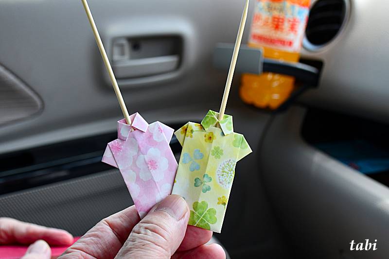 折り紙衣装の可愛らしさに気を良くしましたが、焼まんじゅうを食べるのにこの串を刺すと、この串が細い円柱型のため焼まんじゅうの重い方に回転してしまい食べ難いのです。