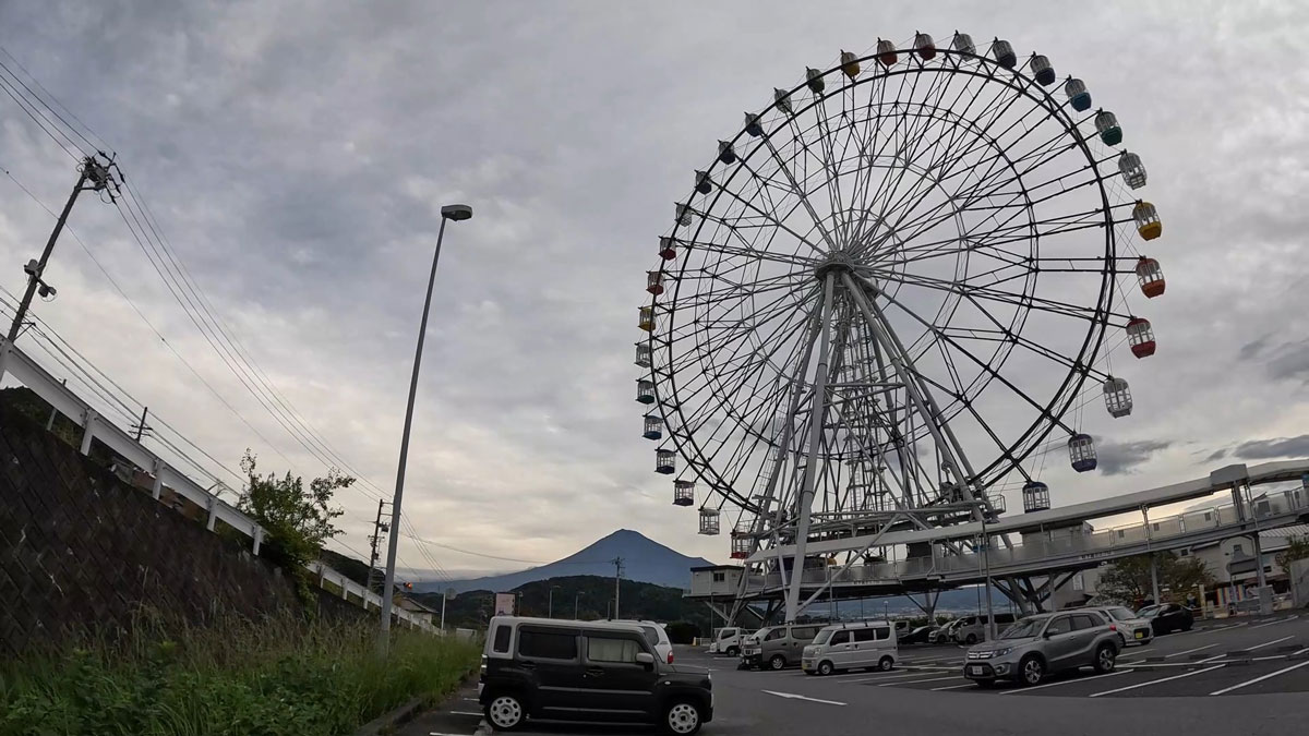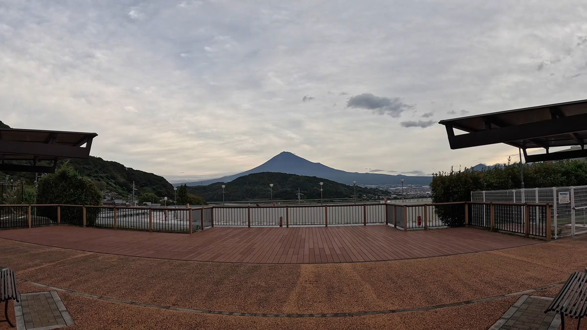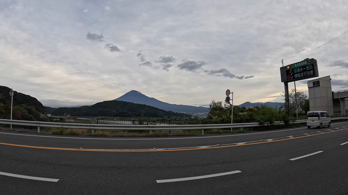 道の駅富士川楽座前から県道を挟んで見えた富士山です。富士山の手前の山は岩本山です。