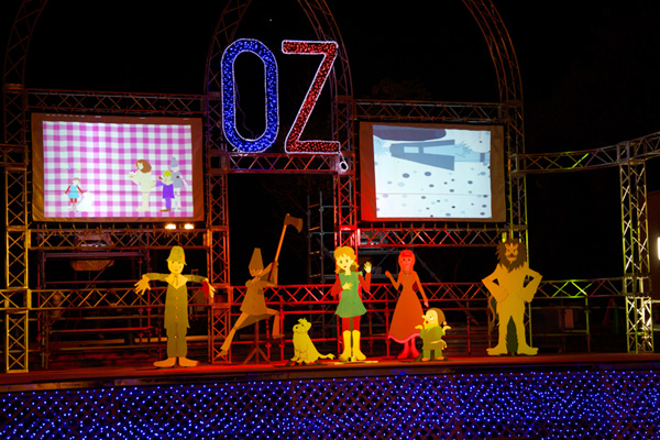 木曽三川公園センターの冬の光物語の今年のイルミネーションは「オズの魔法使いがテーマ」になっています。ドロシーとトトが迷い込んだのは魔法使いのオズの世界。一面を覆い尽くす暖かい光の中に、川の流れのように青い光が印象的に彩っています。その中にドロシーたちが探す夜空の宝石の星のようにストロボが輝き、池の水面には輝く街の煌めきが映し出され、ドロシーたちが旅立つ船からみえる街の明かりがイメージされています。広い敷地がオズの魔法の国へと変わり、黄色いレンガの道やエメラルドの都、出会いの森などが再現され、幻想的でダイナミックなイルミネーションです。
